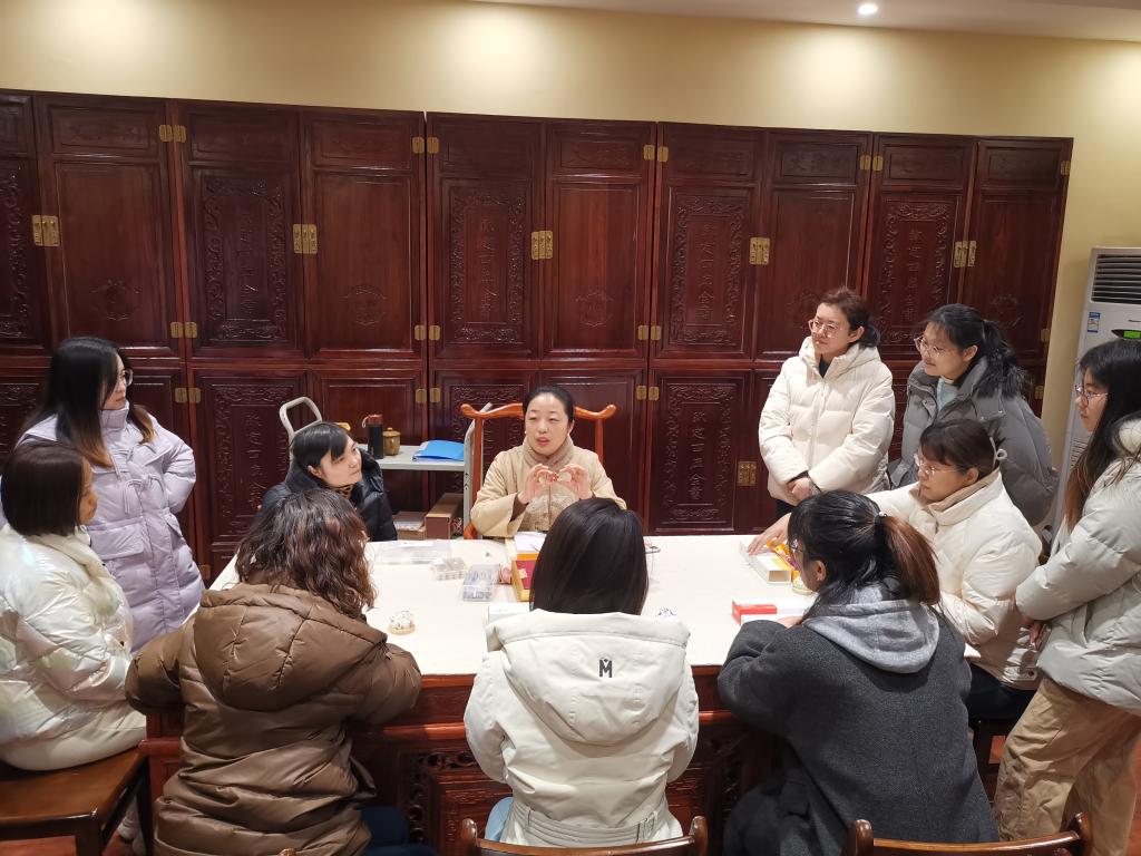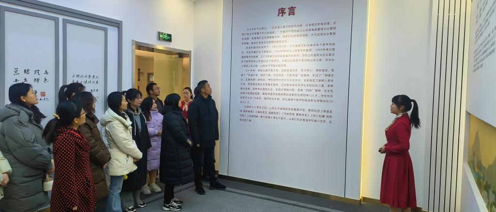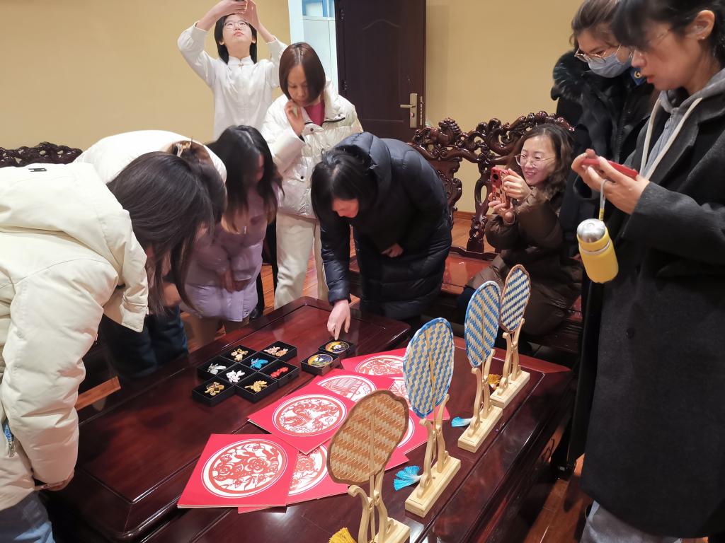 3月8日上午,济南市长清区平安街道平安山庄及共建单位的15位女性工作人员来到学校图书馆,参观学习非遗技法,体验具有女院特色的非遗文化。