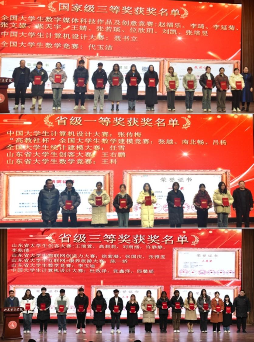 近日,数据科学与计算机学院在图书馆二楼报告厅举办2023年度学科竞赛表彰暨2024年度启动大会。副校长刘恩允出席会议,合作发展处处长于子云、团委书记苏婧、学生工作部(处)副处长赵丽丽、山东八浚通信科技有限公司负责人时延鑫、数据科学与计算机学院领导班子以及部分师生代表参加了大会,大会由数据科学与计算机学院副院长季振东主持。