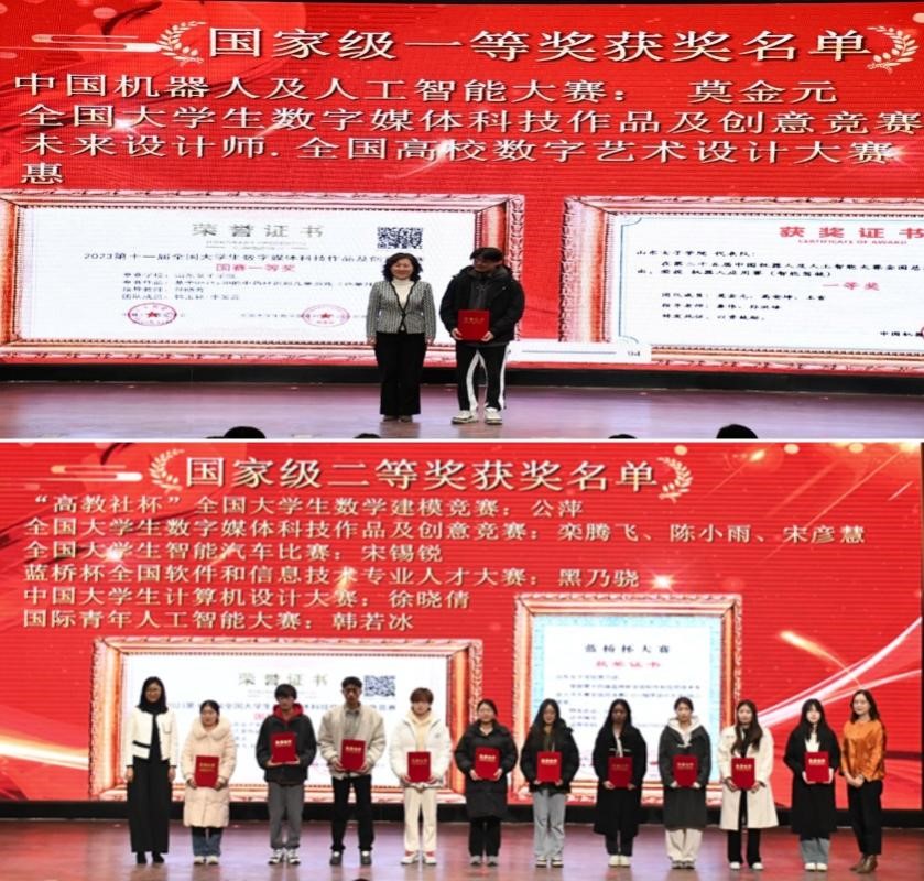 在过去的一年中,数据科学与计算机学院共有550余名学生获得各类学科竞赛省级三等奖以上257项,其中国家级奖项33项。会上,刘恩允副校长首先对2023年度学科竞赛获奖同学表示祝贺,向在学科竞赛中辛勤付出的教师表达感谢。同时也提出未来学科竞赛中要深度结合学院专业特色和优势,优化教学科研建设,创新教学方法和手段,将科创竞赛的相关知识和技能融入日常教学中。最后鼓励同学们要抓住当今时代的机遇,努力塑造自己成为具备复合能力的优秀人才。孙洪峰院长表示学院十分重视各类赛事,并且也取得了很多优异的成绩,未来希望同学们能够积极参与到各类比赛中,将专业知识转化为实践能力。