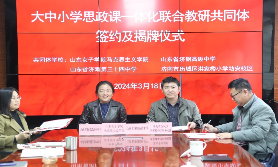 为深入贯彻落实立德树人根本任务,推进大中小学思政课一体化建设,3月18日上午,马克思主义学院在山东省济南第三十四中学参加“大中小学思政课一体化联合教研共同体”签约揭牌仪式。马克思主义学院院长姚树欣、山东省济钢高级中学副校长王文涛、济南市第三十四中学领导班子、历城区洪家楼小学幼安校区副校长季英华及高中部相关教师参加活动。