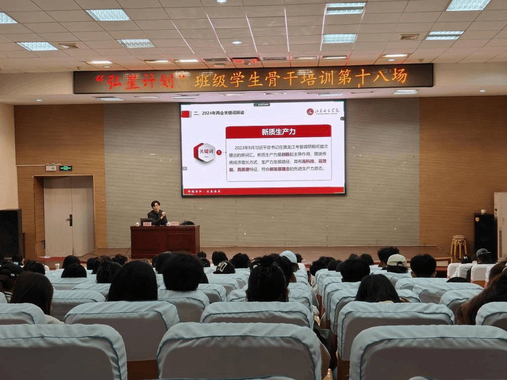 近日,学生工作处举办了第十八场“弘星计划”班级学生骨干培训,红心讲师团成员、马克思主义学院思政课教师焦路尧以《两会历史沿革与2024年全国两会解读》为题,为全校非毕业班班长做专题培训。