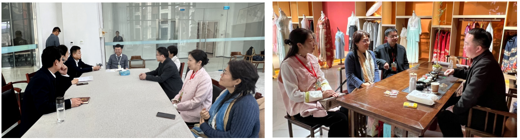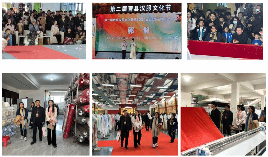 赵崇立一行受邀参加了“第二届曹县汉服文化节暨2024春夏款新品发布会”启动仪式,服装与服饰设计专业负责人郭静、专业教师孙玉凤作为点评嘉宾对春夏款新品展演进行了点评,并与当地文化爱好者互动交流,使他们对汉服文化有了更深刻的认识。随后,又赴数字经济产业园、有爱汉服基地、大集淘宝产业园等地参观调研,了解汉服生产、销售情况,并与企业人员探讨汉服设计、打板制作等问题,与曹县政府主要领导、企业代表进行座谈交流,探讨汉服设计、汉服展演问题,校地对接服务方式,产学研合作项目等。