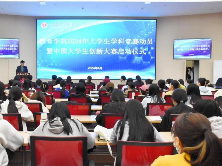为积极响应国家创新发展战略,培养学院学子创新精神与创造能力,进一步提升人才培养质量,4月11日上午,教育学院举行开展2024年大学生学科竞赛动员暨中国大学生创新大赛启动仪式。学院全体领导班子、教研室主任、部分教师及学生代表参会,特邀创新创业学院院长助理李伟老师担任主讲,仪式由副院长刘源主持。