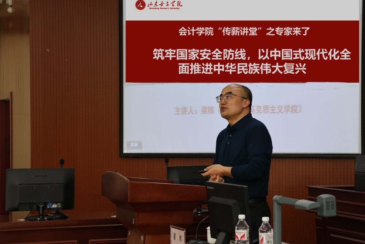 为深入学习贯彻习近平新时代中国特色社会主义思想,进一步引导青年学生强化理论武装、坚定理想信念、厚植家国情怀,在“4•15”第9个全民国家安全教育日来临之际,4月11日,会计学院邀请济南大学马克思主义学院副教授梁栋为师生作报告。学院师生党员、发展对象、入党积极分子、学生会自律会主要学生干部等师生代表参加,讲座由党委书记孔晓晓主持。