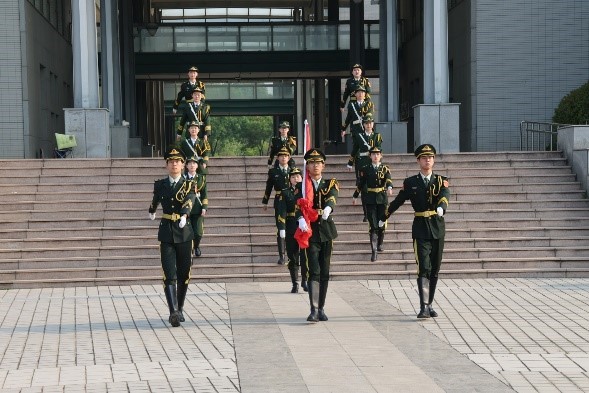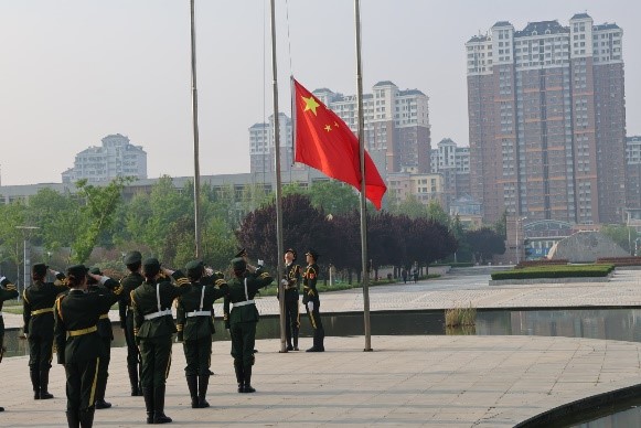 早上7点30分,升旗仪式正式开始。迎着初升的太阳,国旗护卫队迈着整齐的步伐护送五星红旗走向升旗台。伴随着庄严的国歌,五星红旗在师生注目礼中冉冉升起。在场的每一个人面向国旗肃立,炽热的目光表达着对国旗的尊敬,对祖国的崇敬与热爱。