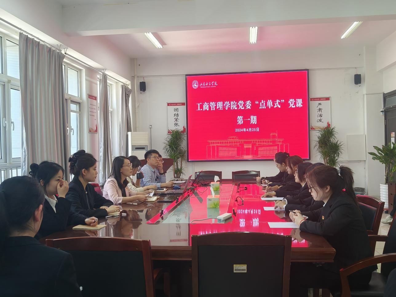 为进一步深化党纪学习教育,全面提升党员教育质效,引导教师党员在落实立德树人根本任务中走在前、作表率,凝聚推动高质量发展的先锋力量,工商管理学院于4月25日在博雅楼A401开展第一期“点单式”党课活动。活动由学院党委书记王兴盈主持,学生党支部书记、学生党员、发展对象参加。