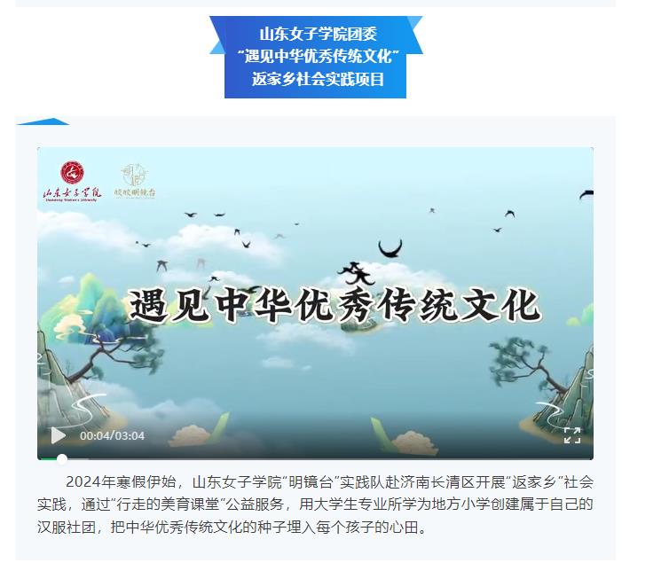 《遇见中华优秀传统文化》短视频展示了学校“明镜台”实践队2024年寒假期间,赴济南市长清区开展“返家乡”社会实践的情况。团队围绕传承中华优秀传统文化,设计打造的“行走的美育课堂”公益教学项目已持续开展4年,用专业所学为地方小学创建属于自己的汉服社团,让美育课程在学校扎根,把中华优秀传统文化的种子埋入每个孩子的心田,让少年儿童在传统技艺传承中品味经典、坚定自信,获得服务学校师生的一致好评。项目短视频在全网展播,展现了女院青年投身全面建设社会主义现代化国家火热实践的青春风采,受到了广大青年的热情关注和喜爱。