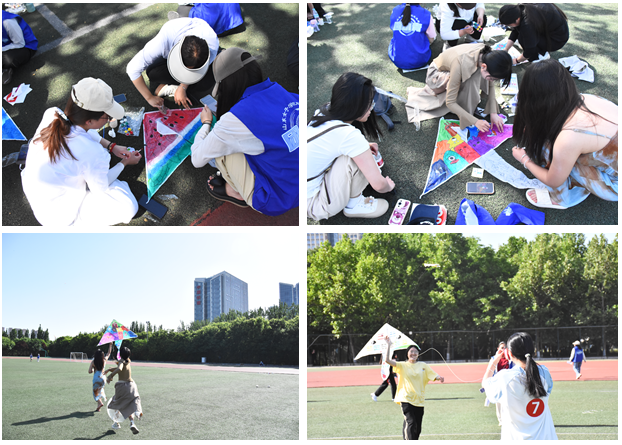 活动分为DIY风筝、作品展示和放飞风筝三个环节,活动开始带队老师介绍了风筝的历史以及文化内涵。随后发放手工制作风筝DIY材料,同学们两人一组协作完成风筝设计绘制,融合劳动教育和美育。接着各组分别介绍了风筝的创意思路及情感寄予,各式各样的风筝有对于生命意义的理解、有对于友谊的阐述、有对于生活的期许以及对于国家强盛的祝福,在分享中同学们借由风筝疏解了自己的情感及情绪。