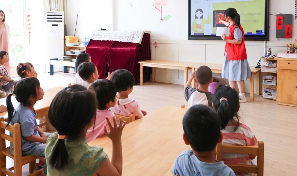 国旗上为什么有五颗星星?党旗上的镰刀和斧头代表什么?“七一”是什么节日......会计学院学生党员宣讲团为幼儿园孩子们带来了一堂精彩的红色小课堂。通过图片展示、特色讲解、互动问答,将爱党爱国的种子播撒进他们的心田,让红色基因滋养祖国未来。