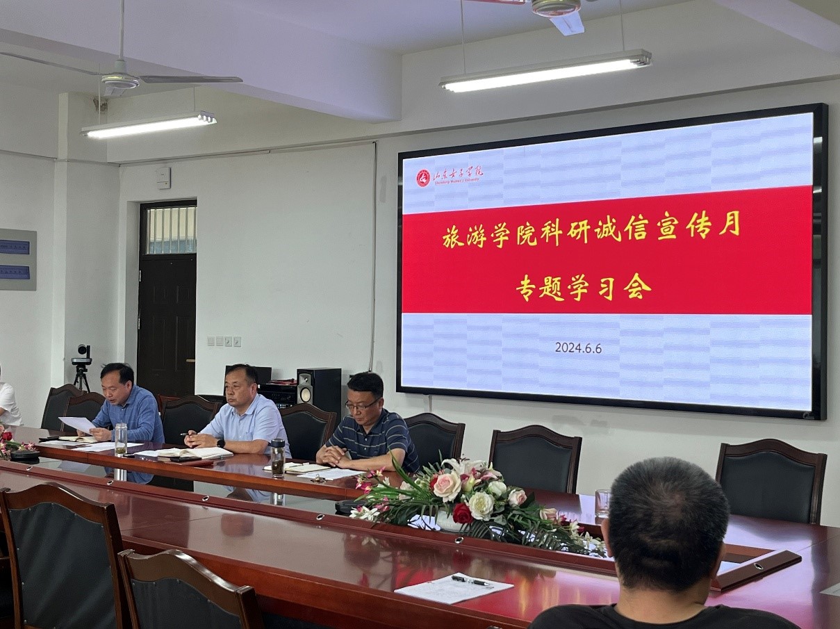 近日,旅游学院召开党政联席会议专题研究科研诚信教育工作,副院长鲁春晓通报了学校科研诚信宣传月的相关要求,包括教育与预防、受理与调查、认定、处理、监督等方面。会议强调,要从师德师风建设的高度认识科研诚信工作重要性,定期组织全体教职工进行专题学习。