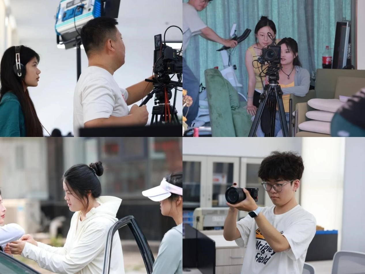 对学生来讲,这次不仅是一场专业知识和技能的实践,也是一次从校园走向工作岗位的历练,更是一场鲜活的课程思政教育。在微短剧拍摄现场,传媒学院师生齐心协力、分工明确,有条不紊地开展拍摄工作。拍剧照、拍花絮、现场纪录片、导演助理、摄影助理、演员助理、当场务、做群演……从室内到38度高温的室外,从清晨到深夜........面对高强度的拍摄工作,学生始终保持着高度的热情、认真的工作态度来对待这次驻组工作,演绎了一场传媒学子“职场小白”塑形记。