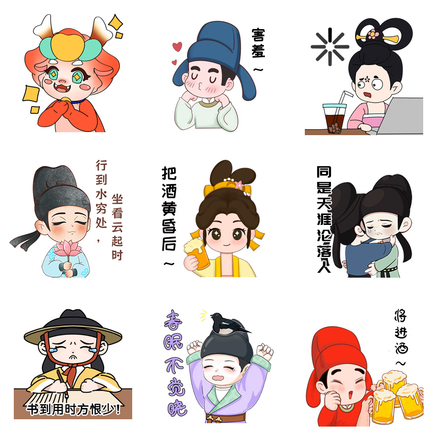 同时,设计团队还进行了诗词文创人物动态表情包的设计,目前9款动态表情包已在微信平台发布,用户可通过微信表情搜索“古偶天团”表情专辑添加使用。