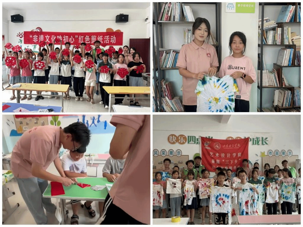 在房家村,志愿者们走进“四点半课堂”,为孩子们开展丰富多彩的美育活动,让孩子们在欢笑中了解到扎染和剪纸两项非遗文化传统手工艺的相关知识、学习了扎染手工艺术、体验了剪纸艺术的独特魅力,感受到艺术创作带来的乐趣,提升了孩子们欣赏美和创造美的能力,在潜移默化中让非遗文化得到了传承。志愿者们纷纷表示,自己在大学课堂中的所学所感,能分享给孩子们,和他们一起学习美、创造美、传承美非常有获得感和幸福感,他们也将以此次活动为契机,继续努力学习、提升自我、服务社会,为实现乡村振兴和中华民族伟大复兴的中国梦贡献自己的青春力量。