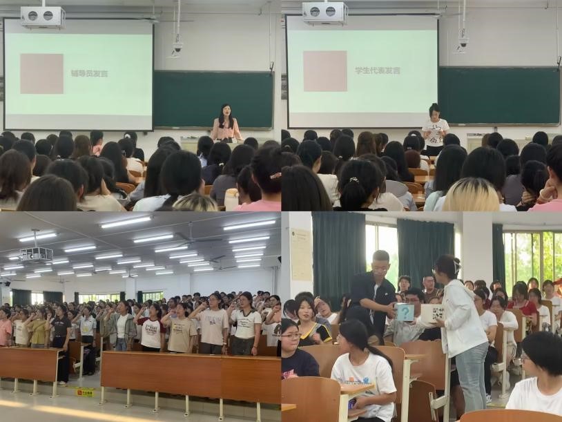 孔晓晓对全体新生表示热烈欢迎,并详细介绍了学院的专业设置、师资力量、教学成果以及丰富的教学资源。同时,叮嘱学生要学会做人、学会做事、学会学习,心怀梦想,砥砺前行。新生辅导员赵文文着重强调了入学教育的重要性,鼓励新生努力转变角色,珍惜大学时光,积极参与各项活动,提升自身综合素质。新生代表表达了对大学生活的憧憬和期待,也表示将以饱满的热情投入到学习和生活中。最后,全体新生进行了诚信学子宣誓,在庄严的宣誓声中,新生们承诺将尚德守信,创新务实,争做诚信会计人!同时为学生送上“计算器”等惊喜礼品,鼓励学生学好专业课。