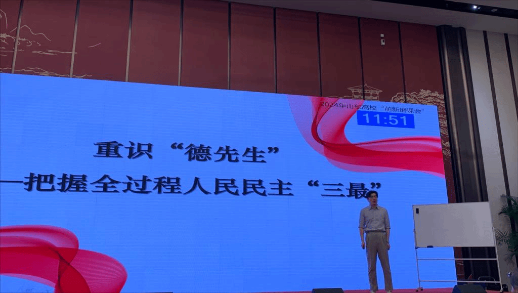 在教学展示阶段,24位青年教师分为本科组和高职组进行教学展示。焦路尧以《重识“德先生”——把握全过程人民民主“三最”》为题,从对话“德先生”开始,回顾旧式民主在中国遭遇的坎坷,论证西式民主发展模式暴露出的弊端,阐释为什么全过程人民民主是最广泛、最真实、最管用的民主。焦路尧以独特新颖的教学设计,谆谆善诱的讲解过程,生动风趣的教学风格,向评委专家全方位展示了学校青年思政教师良好的精神风貌,受到评委专家、现场观众的一致好评,取得本科组第一名的好成绩,成功晋级山东高校思想政治理论课2024年度“萌新磨课总会”,这也是学校思政课教师第一次入围。