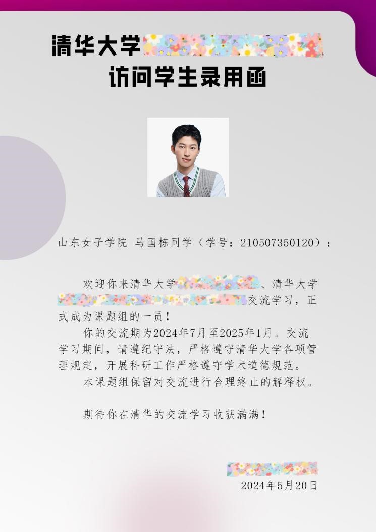 在山东女子学院的学习生活中,马国栋同学对数据和量化产生了浓厚的兴趣,他利用平时时间,积极申请国内外院校的访问和暑期研学机会,希望通过经过培养和锻炼,加强自己的科研能力,并建立学术界的联系,终于该生有幸收到了清华大学新闻与传播学院的访学邀请,可以和国内外优秀硕博、优秀的老师进行思想碰撞,迸发灵感的火花。