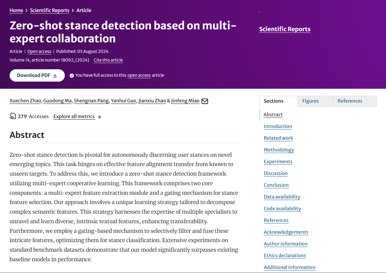 马国栋,数据科学与计算机学院(人工智能学院)2021级人工智能(校企)班长,近日在学院赵学臣老师的指导下以共同第一作者的身份在SCI一区期刊《Scientific Reports》发表了重要文章,该生在校期间曾获国际青年人工智能大赛二等奖、中国高校智能机器人创意大赛山东省二等奖、国际青年人工智能大赛赛区二等奖等多项荣誉。
