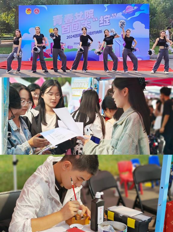 9月27日,“青春女院百团大绽”2024团属学生组织纳新活动在求真楼东广场举行。72个学生社团、校学生会、青年媒体中心等学生组织集中纳新,吸引新生广泛参与。