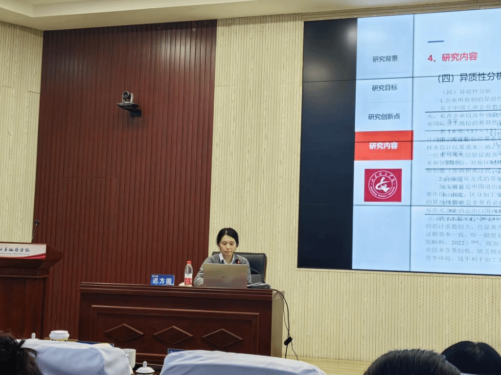 研讨会上,经济学院教师迟方圆博士在“对外贸易高质量发展”分论坛作了《地区制度质量对中国制造业全球价值链地位的影响研究》学术交流,汇报得到与会专家的赞可和一致好评。