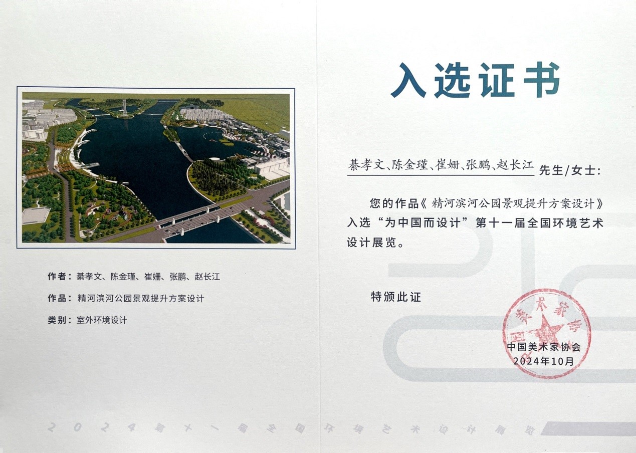 10月26日,由中国美术家协会主办,中国文联美术艺术中心、中国美术家协会环境设计艺术委员会、天津美术学院承办的“为中国而设计——第十一届全国环境艺术设计展览”在天津美术学院举办,艺术设计学院环境设计教研室教师团队作品“精河滨河公园景观提升方案设计”成功入选。本届活动全国共入选212项作品,山东共入选14项作品。