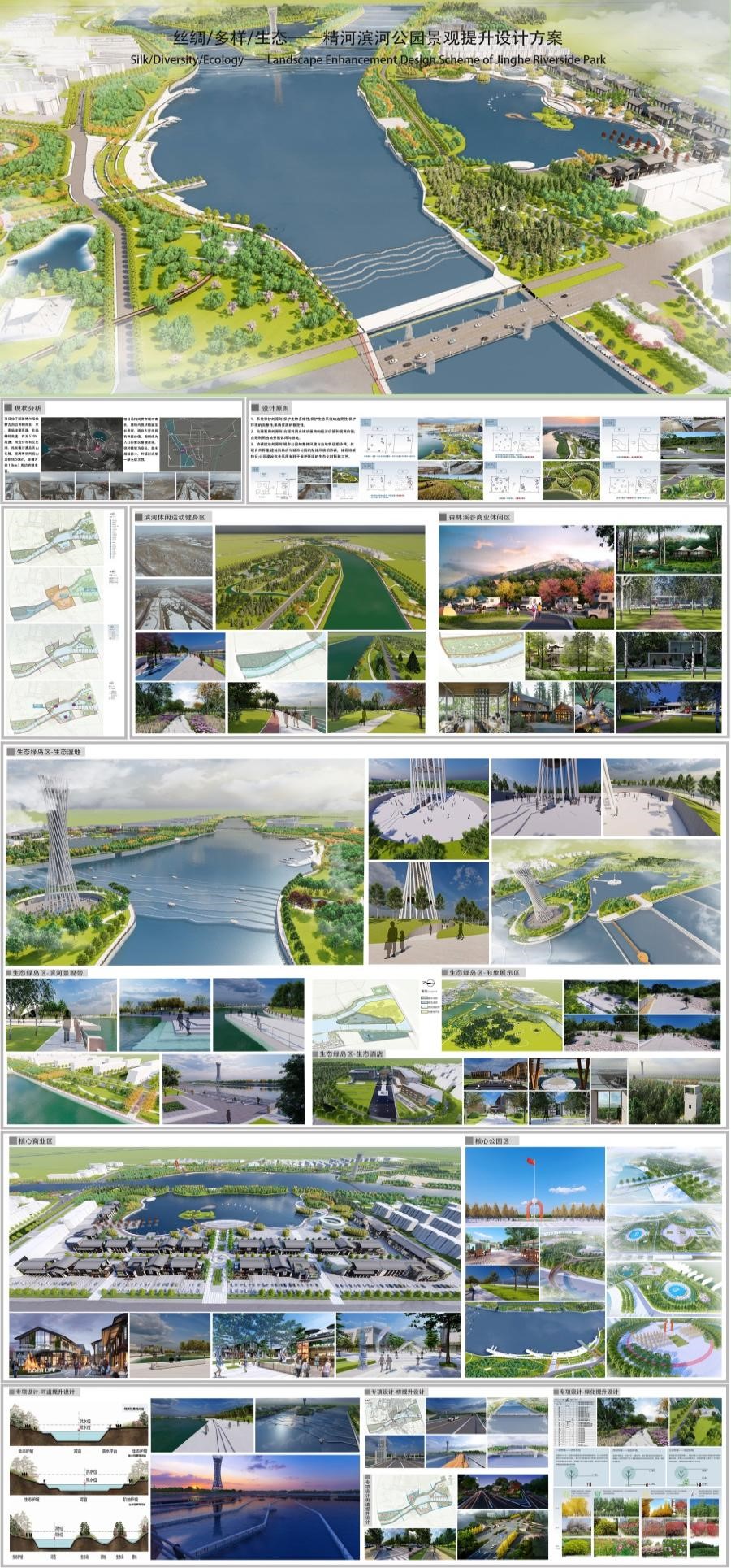 “精河滨河公园景观提升方案设计”由环境设计专业教师綦孝文、陈金瑾、崔姗等共同创作。方案以新疆精河县境最长、水量最大的河流——精河为设计对象,以提升精河县城市形象为设计目标,聚焦其优越的山、沙、河、湖等地理条件以及丝路、古城等人文因素,守生态平衡、重文化落地、试创新融合,方案既体现出滨河景观设计的多层次内容,又表达出厚重的历史文化与崭新的城市面貌。