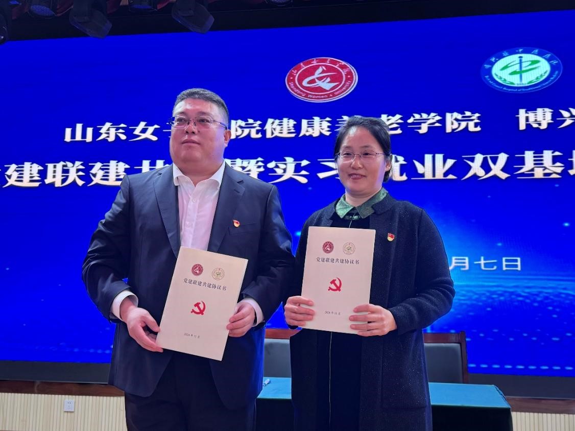为深入学习贯彻习近平新时代中国特色社会主义思想和党的二十届三中全会精神,充分发挥党建引领作用,11月7日,健康养老学院与博兴县中医医院举行党建联建共建暨实习就业双基地签约仪式。博兴县委常委、组织部部长黄广宪,县委常委、副县长、县委卫生健康工委书记范国龙,县委卫生健康工委常务副书记、县卫生健康局党组书记、局长李晓营,博兴县中医医院党委书记袁玉春,医院其他班子成员;学校合作发展处处长于子云,组织部副部长耿华及健康养老学院师生代表参加仪式。