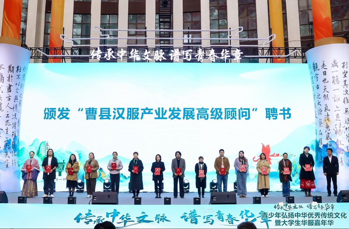 大学生华服嘉年华活动作为落实共青团中央“青春传承中华文脉工程”的具体举措,活动以“传承中华文脉 谱写青春华章”为主题,深度融合曹县独具特色的汉服制造产业链,吸引了来自全国各地56所高校、200余名高校传统文化研究领域的专家学者和有着华服兴趣爱好的青年朋友们的广泛参与,活动现场为14名省内外高校华服领域专家颁发了“曹县汉服产业发展高级顾问”聘书。