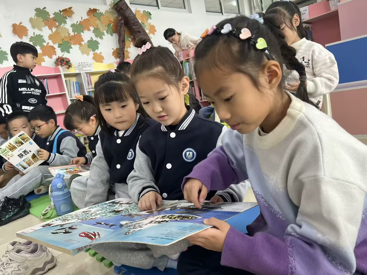 随后,孩子们分组对自选绘本进行自主欣赏。雷惠文、孙照欣两位同学化身为绘本讲解员,引领孩子们深入绘本世界,探索其中的奥秘。在最后的自主阅读环节,孩子们自由选择绘本,尽情感受阅读带来的乐趣。