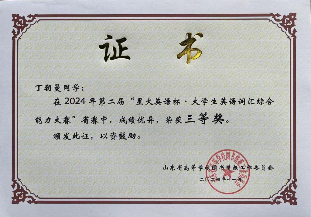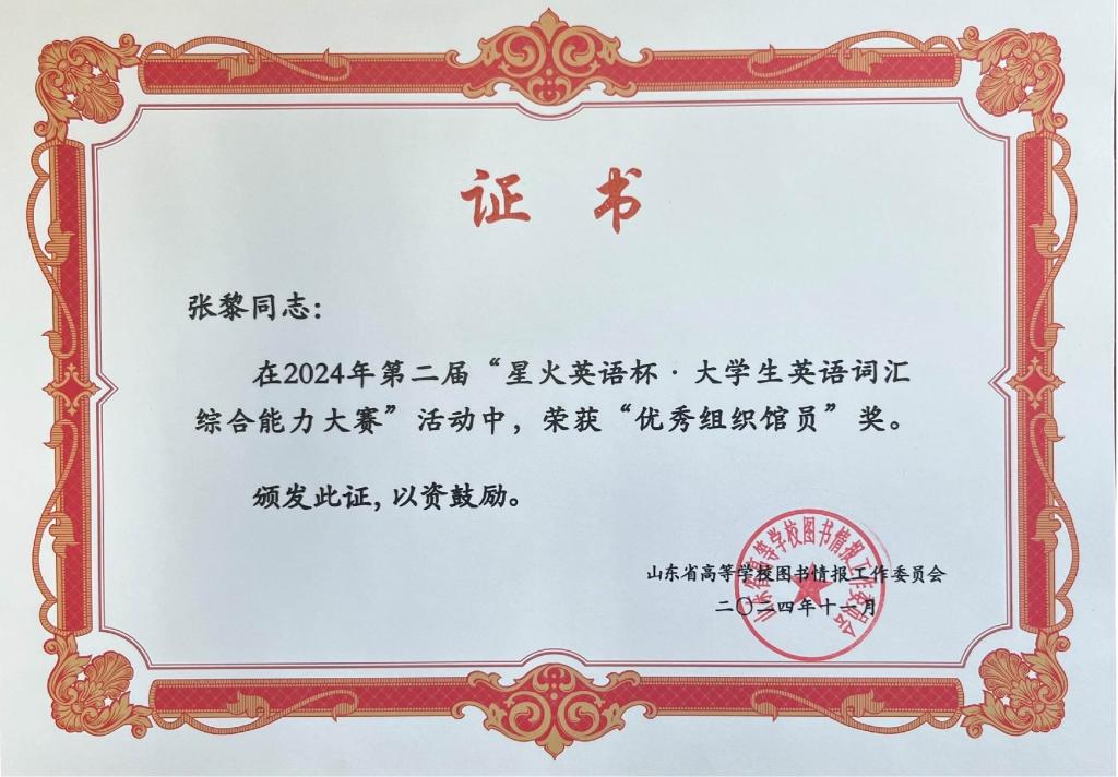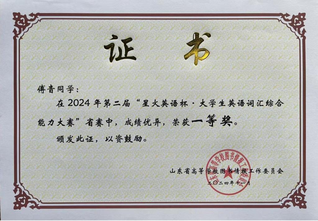日前,由山东省高等学校图书情报工作委员会主办、山东省高校图工委文化建设专业委员会等联合承办的第二届“星火英语杯•大学生英语词汇综合能力大赛”圆满结束。本次大赛共有来自全省94所高校的两万多名选手参加,经过初赛与决赛的层层选拔,学校外国语学院傅音同学凭借99.00的优异成绩,位列全省第六名,荣获省级一等奖;丁朝曼同学位居全省第51名,荣获省级三等奖。图书馆张黎老师荣获“优秀组织馆员奖”。