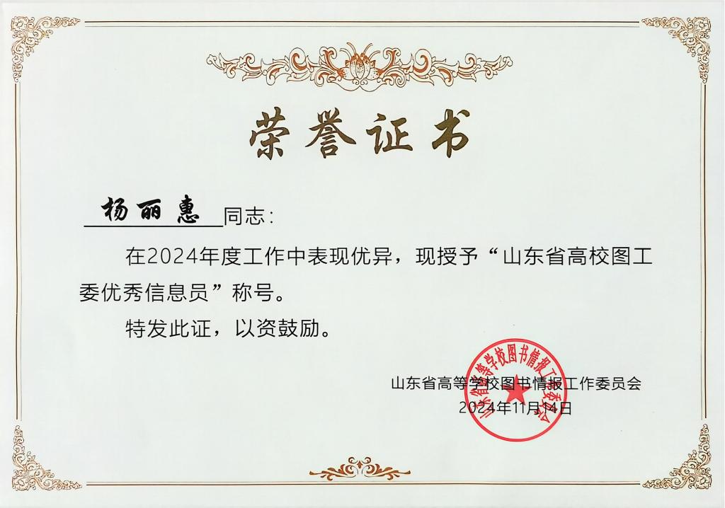 近日,我校图书馆馆员杨丽惠在山东省高等学校图书情报工作委员会举办的优秀信息员评选活动中脱颖而出,荣获“山东省高校图工委优秀信息员”称号。此次评选活动面向全省高校,旨在表彰在图书情报工作中表现突出的信息员。
