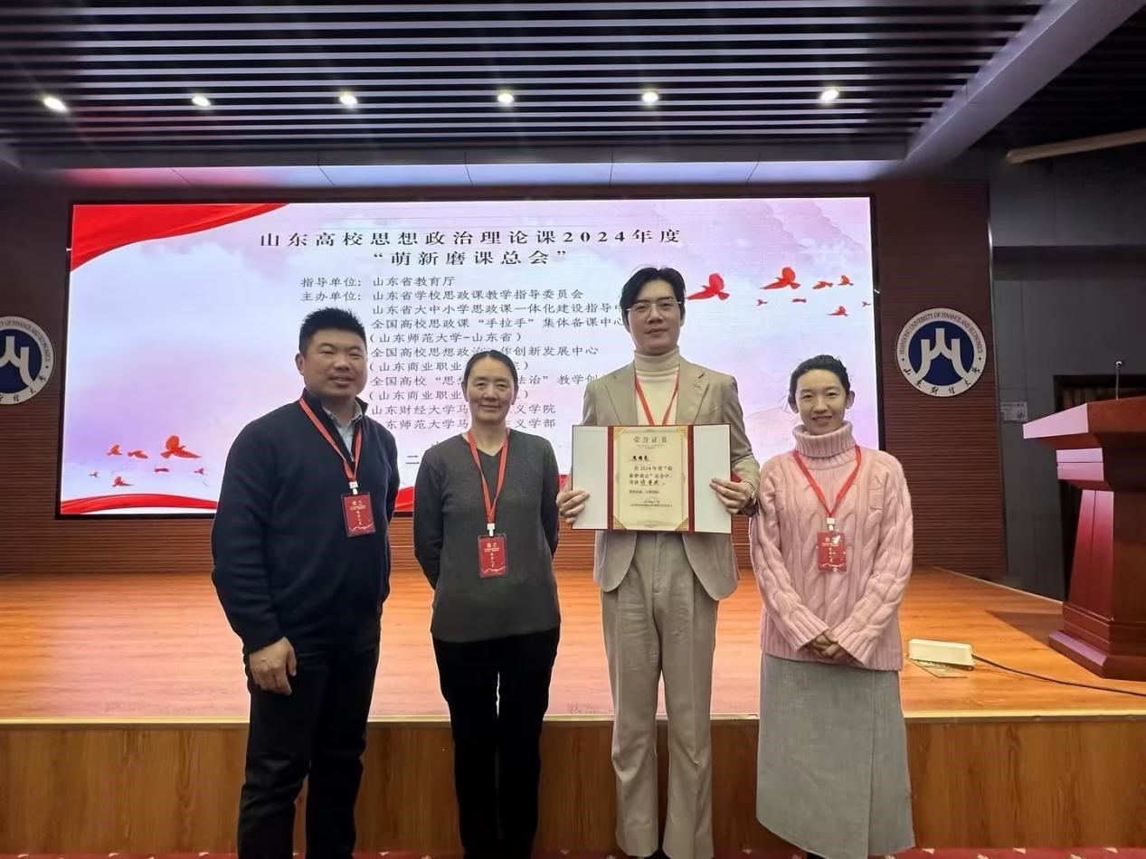 11月29日,山东高校思想政治理论课2024年度“萌新磨课总会”在山东财经大学举办,学校思政课教师焦路尧荣获本科组特等奖,这是学校教师首次获此殊荣,实现了思政课获奖在该项目上的突破。李晶晶获得该项赛事的二等奖。