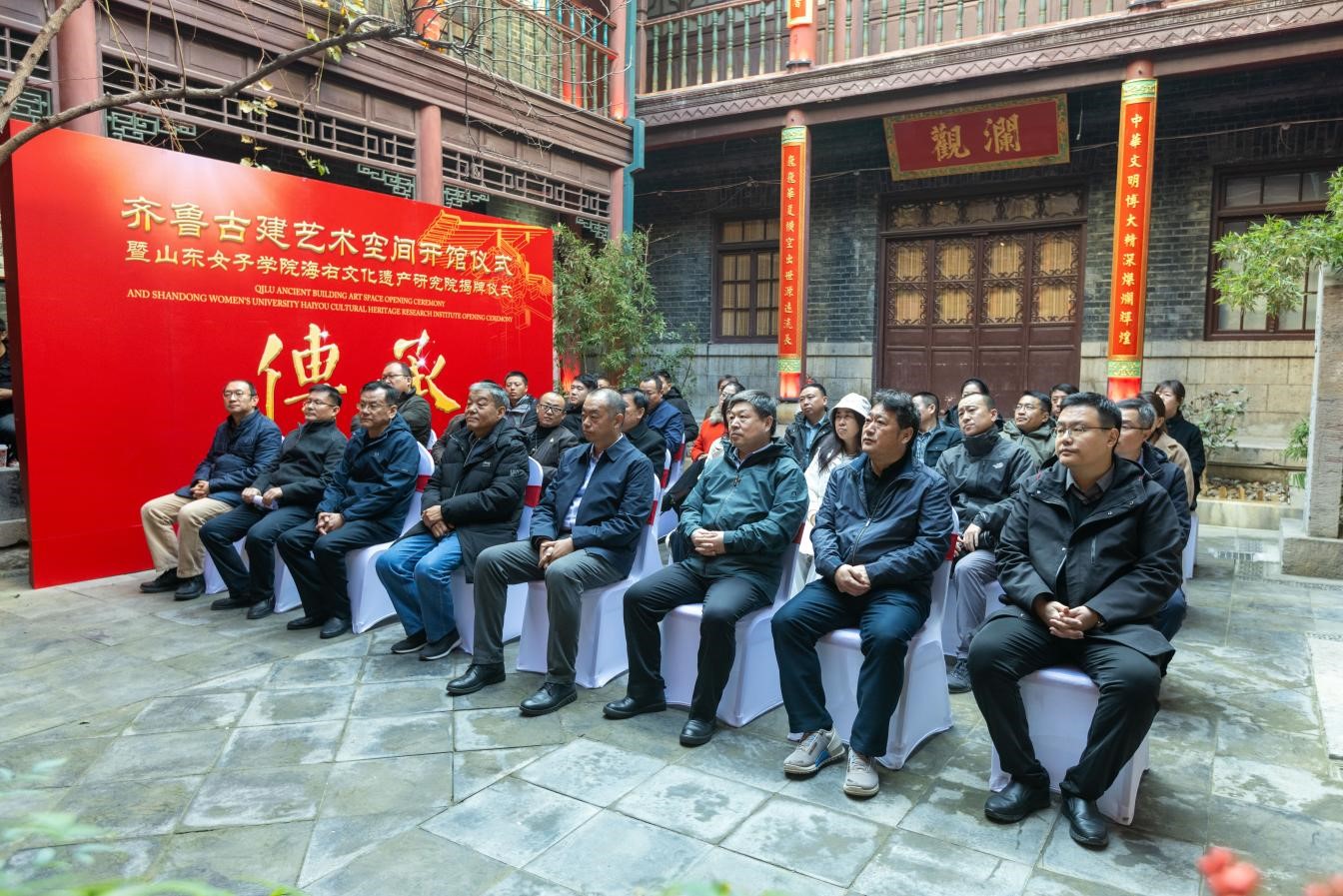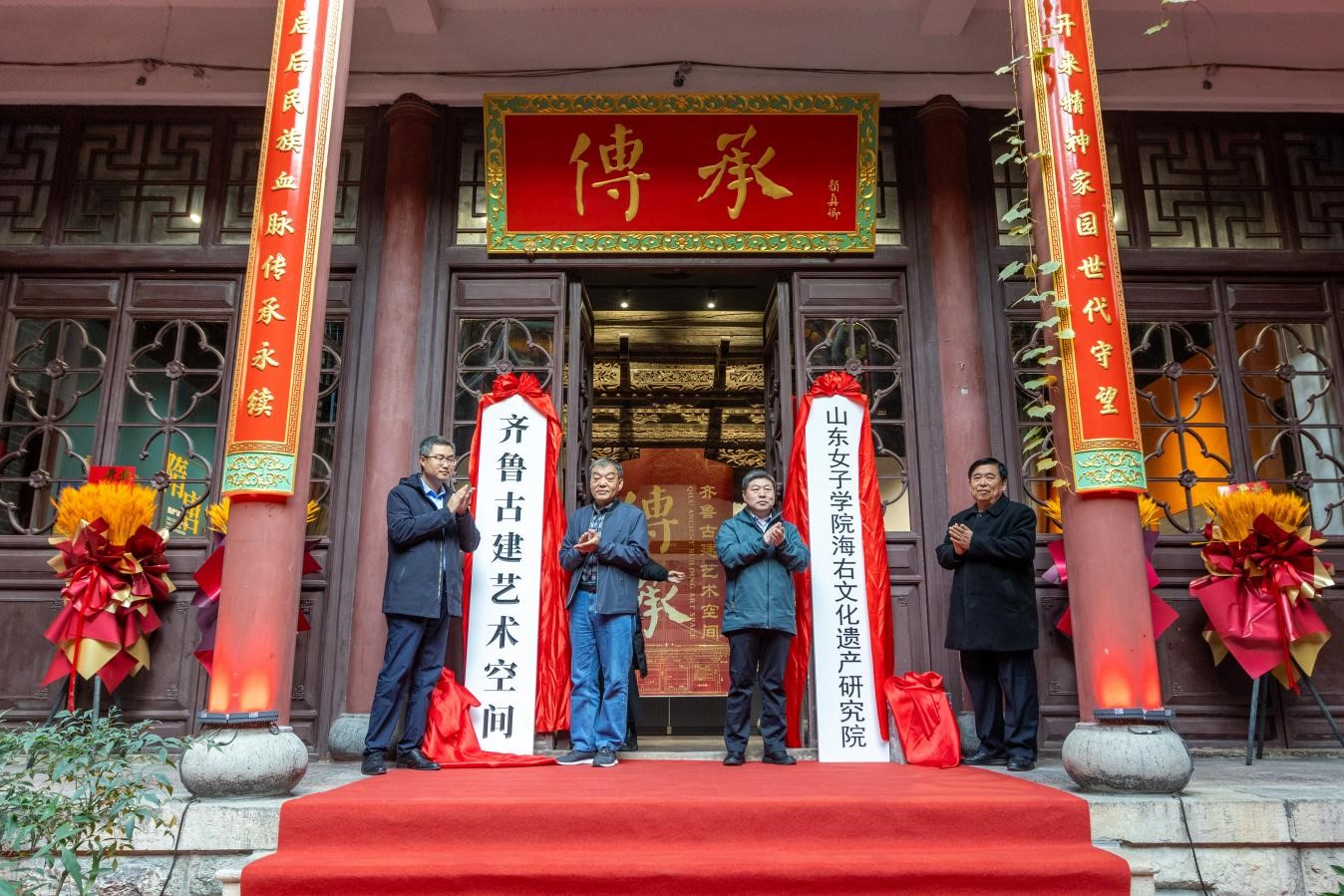 任骁瑞、赵崇立、史国兴先后致辞。崔大庸、董玉新和海右文化遗产研究院顾问、济南市考古所原副书记王晶、史国兴共同为“齐鲁古建艺术空间”和“山东女子学院海右文化遗产研究院”牌匾揭牌。