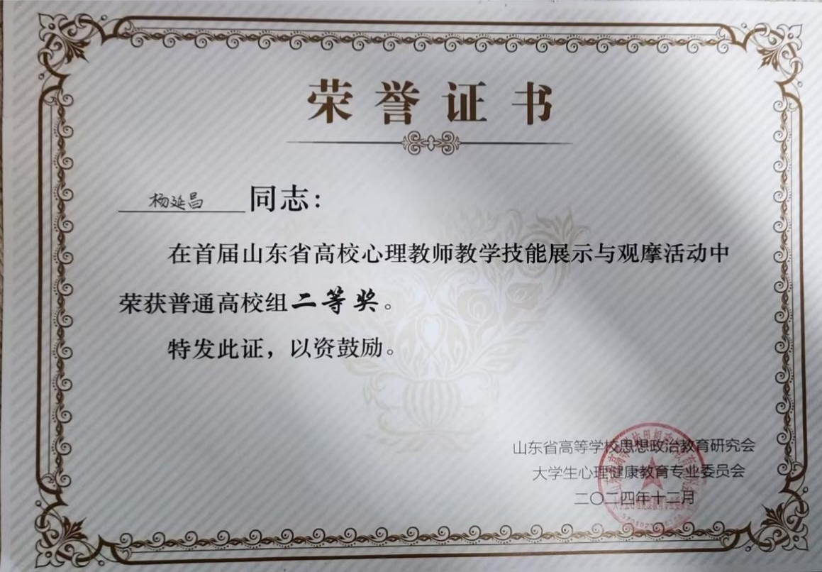 12月6日,首届高校心理教师教学技能展示与观摩活动在聊城大学举办。学校学生工作处心理健康教育指导中心杨延昌老师以优异的成绩荣获二等奖。