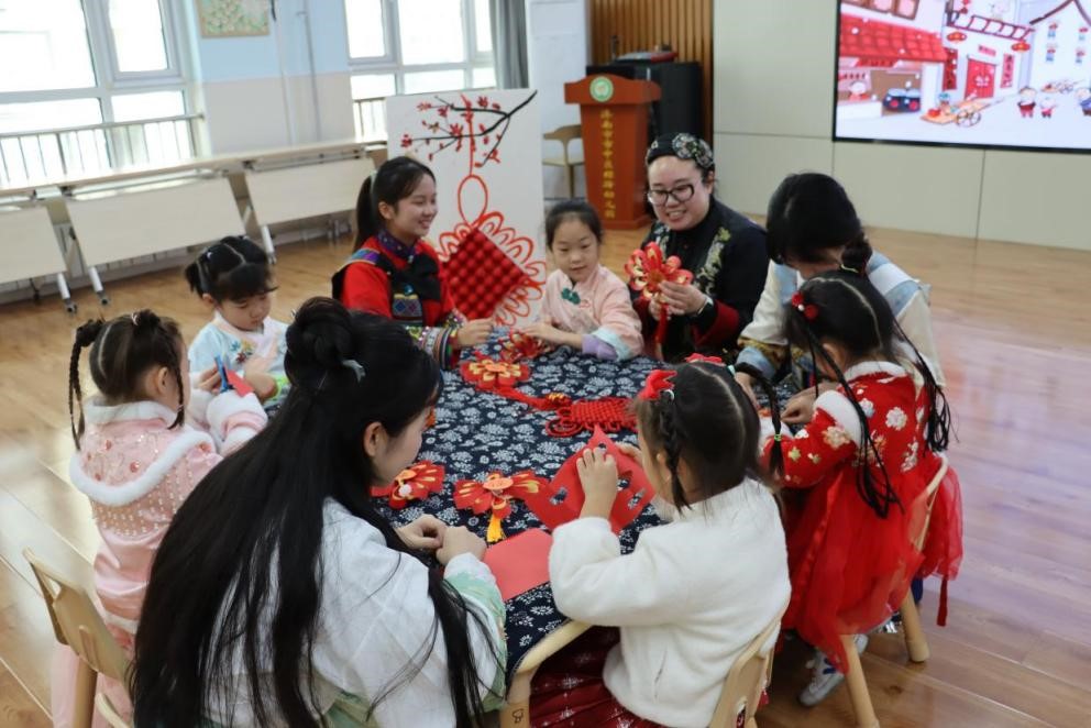 悠悠古韵,千千结艺。“巾帼班”的学生们化身“结艺小老师”,与经驿幼儿园的老师一起带领小朋友们走进了中国结的奇妙世界,在体验中了解中国结的发展历史、基本样式、制作步骤和美好寓意。她们与孩子们一同将吉祥、美好、幸福的愿望编织进手中的红绳,织成的“中国结”象征着不同民族情感连接的美好纽带。