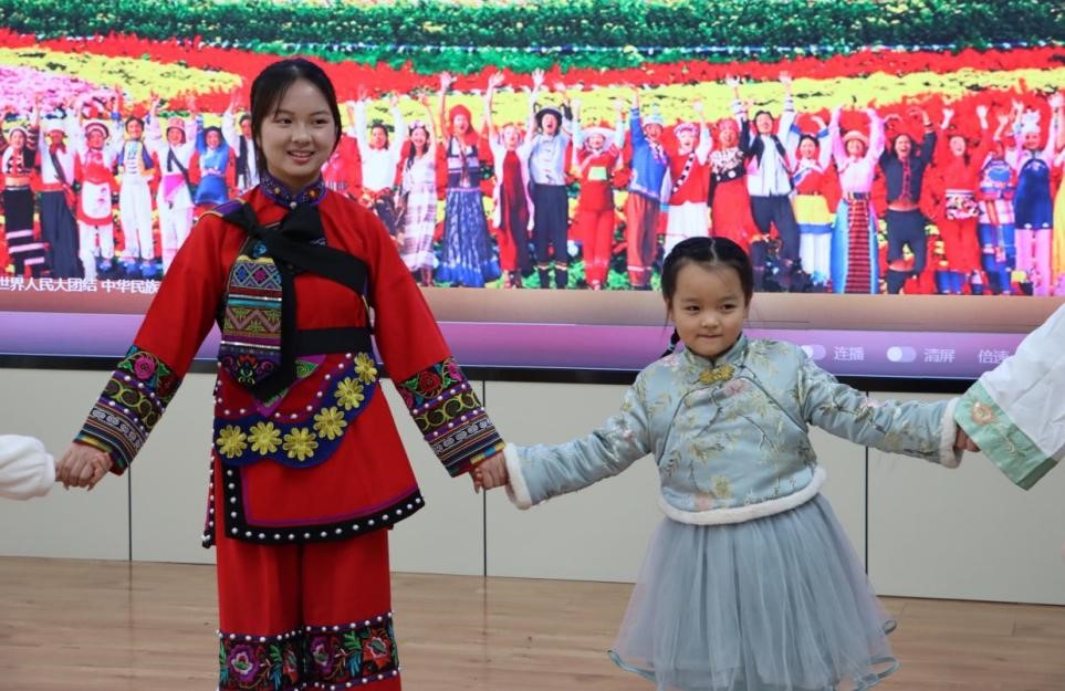 "五十六个星座,五十六枝花,五十六族兄弟姐妹是一家……" 这激昂的旋律和深情的歌词,点燃了“巾帼班”学生和孩子们的热情。部分少数民族学生,展示各具特色的民族服饰,与幼儿园师生欢聚一堂,载歌载舞,唱出了民族团结、对祖国的热爱和对未来的憧憬和期待。