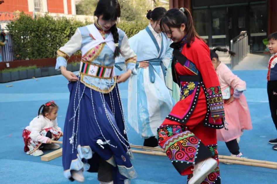 经驿幼儿园的教师们向学生们介绍了竹竿舞的历史和文化内涵,通过精彩示范,带领“巾帼班”的学生们一同领略竹竿舞的独特魅力。在欢快的节奏中,学生们与幼儿园的小朋友们一起轻盈地跳跃,感受到民族文化的持久魅力,加深了友谊,培养了团结协作能力。