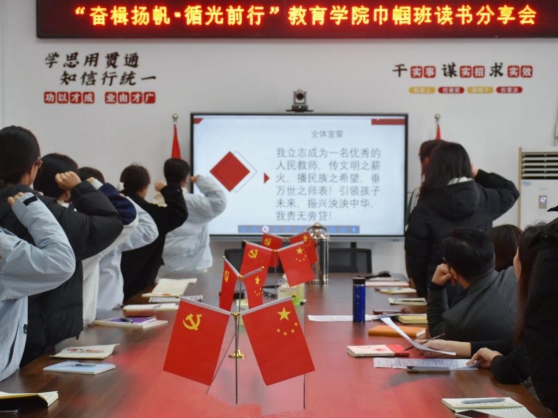 在阅读分享环节,王飞围绕《我本是高山》中的“本”字,与大家进行了深入交流。他引用《论语》中“君子务本,本立而道生”一句,引导同学们寻找自己的“根本”并坚守下去,就成语“本末倒置”来引导同学们对自己大学生活的思考,如何正确处理大学时期的“本”和“末”。路敏对同学们提出三点要求:一是树立终身学习的理念;二是培养坚韧不拔的品质;三是注重学以致用,鼓励每位同学在学习的道路上永不停步,用爱心、耐心和责任心去拥抱每一个挑战。最后,进行师范生宣誓仪式。