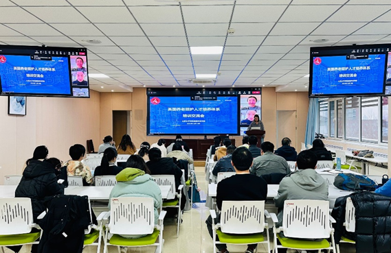 帅子英博士结合自身近30余年的临床护理实践及护理管理、教育等从业经验,宏观介绍了英国老龄化现状及英国长期照护的背景情况,强调了完善养老照护人才培养体系在提升养老服务质量方面的重要意义,对比介绍了英国长期照护人才的培养现状与问题,提出要打造多元化养老照护人才培养模式,推动照护人员团队逐步走向规范化、标准化、专业化,促进全球养老服务业高质量发展。随后,学院专业老师与帅子英博士进行互动交流。