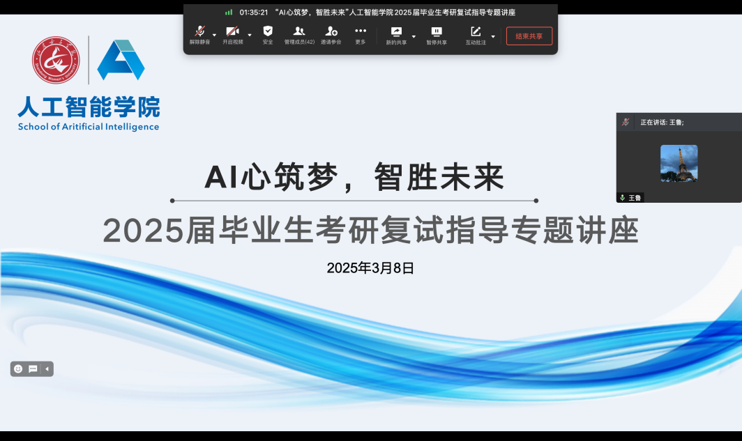 为全面助力2025届考研学子高效备战复试,帮助学生深入了解复试及调剂流程,掌握应试技巧,提升核心竞争力,3月8日上午,人工智能学院通过腾讯会议成功举办“AI心筑梦,智胜未来”考研复试指导专题讲座。本次讲座由学院教学负责人王鲁教授主讲,学院党委副书记白琨主持,学院毕业班辅导员及部分考研学子在线参加。