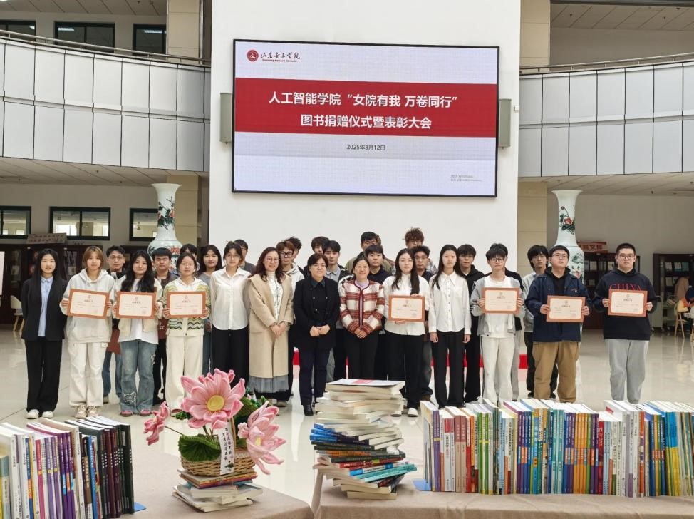 为弘扬书香文化,凝聚爱校情怀,助力学校高质量发展,人工智能学院于3月12日下午在图书馆举行“女院有我 万卷同行”图书捐赠仪式暨表彰大会。图书馆馆长成曙霞、学院党委书记崔江宁及教师、学生代表共同参加活动,以书籍传递智慧,以行动彰显担当,助力学校发展。