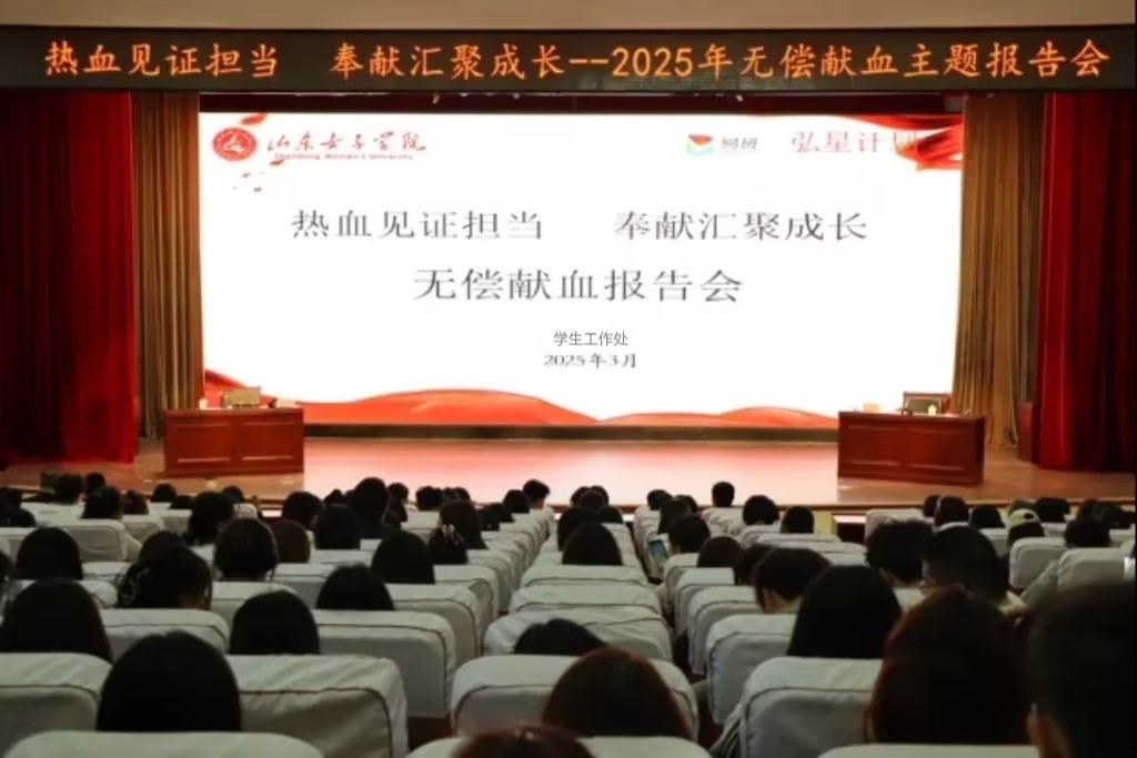3月20日,学校在图书馆二楼报告厅举办“热血见证担当,奉献汇聚成长”无偿献血主题报告会,特邀山东省无偿献血宣传大使---齐鲁工业大学(山东省科学院)经济与管理学部党委书记姜洪雷主讲。学生工作处负责人、各学院辅导员代表、弘益志愿服务队成员及学生代表共计300多人参加。讲座由学生工作处副处长贾萍萍主持。