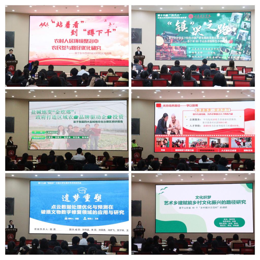 决赛分项目展示和现场答辩两个部分。项目展示阶段,21支团队在求真楼大厅布展,团队成员与到场师生进行交流。现场答辩阶段设置答辩陈述和评委质询两个环节,各参赛团队利用PPT辅佐展示,就项目背景、实践过程、社会价值等多方面进行阐述,重点剖析项目亮点与创新点,全方位展示项目作品。本次参赛作品依托办学特色和学科优势,紧扣科技前沿和社会需求,涵盖“一老一小”、人工智能、乡村振兴、思想引领、社会科学、数字经济等多个领域,充分展示女院学子的创新思维和实践能力。评委老师从专业角度出发,根据项目具体情况进行质询,从科学性、先进性、现实意义等方面点评,在提出疑问的同时,也针对短板和不足给予建设性建议。答辩选手认真聆听评委指导,积极回应,互听互学,收获满满。