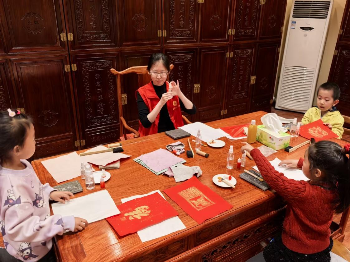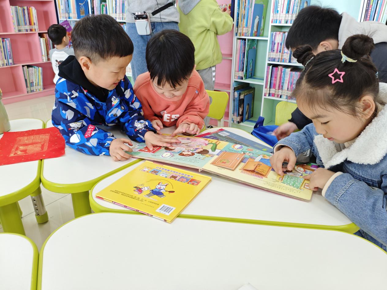 活动特别设置非遗文化体验区,盘扣、剪纸、金丝掐画等展品引得孩子们频频驻足。图书馆馆员以“讲故事+手作体验”形式,带领幼儿制作简易拓片,让传统文化在指尖流动。在童趣盎然的绘本馆,一进门,孩子们就被五颜六色的绘本和充满童趣的装饰所吸引。在老师的引导下,孩子们自由选择喜欢的绘本,有的坐在小椅子上专注阅读,有的三三两两围坐在一起分享故事。在阅读过程中,工作人员和大学生志愿者耐心地为孩子们讲解绘本内容,解答他们的各种奇思妙想。
