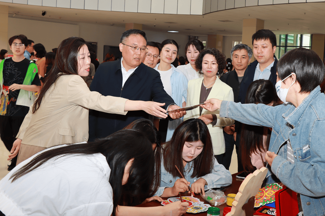 学院党委理论学习中心组在校成员与师生代表共同参观了在学校图书馆大厅举办的非遗传承展览并现场体验了社火面具、剪纸、结艺、面塑、糖画、微雕、蛋雕、缮焗等非物质文化遗产技艺。通过沉浸式学习,参与者们深刻感受到中华优秀传统文化的博大精深,进一步理解了习近平总书记提出的“中华优秀传统文化是中华民族的根和魂”重要论断。