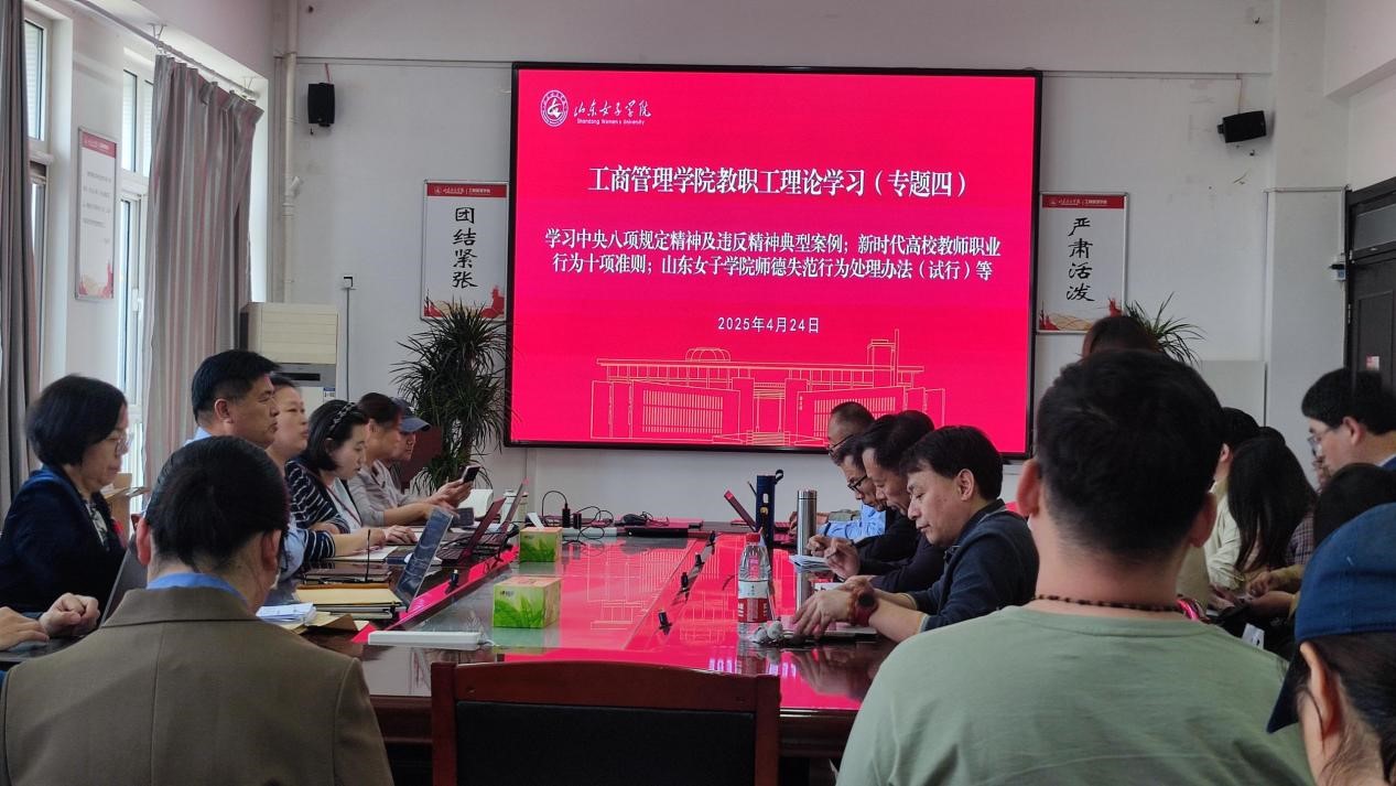 4月24日下午,工商管理学院召开全体教职工理论学习会,专题学习中央八项规定精神及典型案例警示教育、新时代高校教师职业行为十项准则,以及山东女子学院师德失范行为处理办法(试行)等,学院党委书记耿华主持会议并讲话。