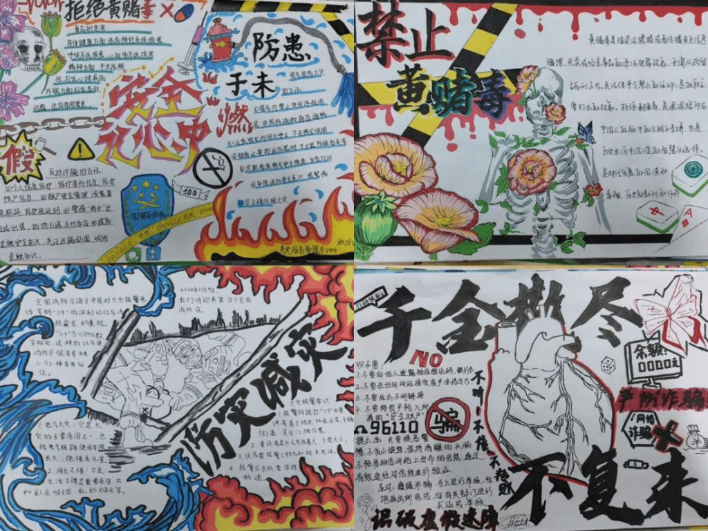 4月19日至22日,学院开展“筑牢安全防线,守护美好生活”手抄报及征文活动,共收到学生作品146件,参与人数达500余人。学生们围绕火灾案例、拒绝黄赌毒、防诈骗、拒绝校园暴力等主题进行创作,最终评选出35件优秀作品。