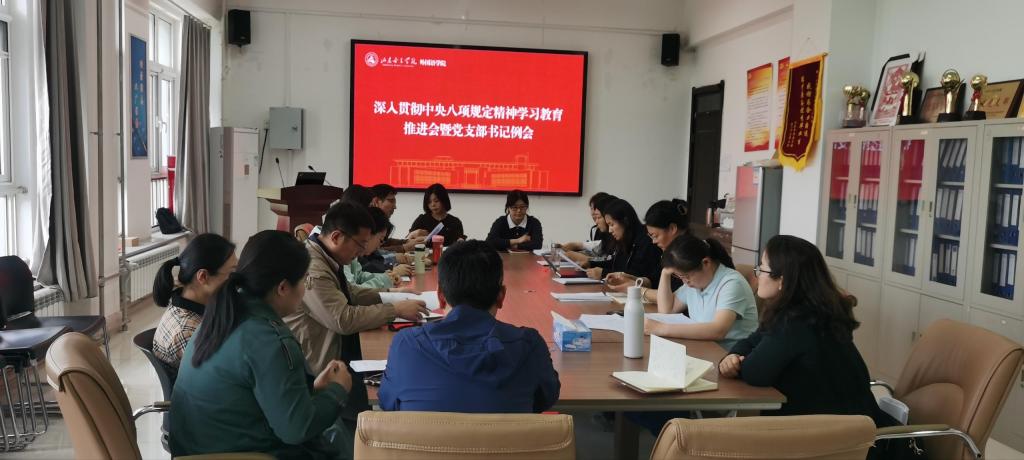 会上,学习传达了山东省委和学校党委深入贯彻中央八项规定精神学习教育工作专班的通知要求和学校学习教育工作推进会会议精神。总结反馈了学院党委和各基层党支部上一阶段学习教育推进情况,系统介绍了学校开展深入贯彻中央八项规定精神学习教育实施方案,并对学院党委的方案进行了详细解读。制定了理论学习清单,指导基层党支部突出学习重点,确保学习内容上下贯通。规范了学习教育方案计划、会议记录、清单台账等材料的归档、上传的核查标准和流程。征求了对学院党委班子和成员在落实中央八项规定及其实施细则方面存在的问题和意见建议。