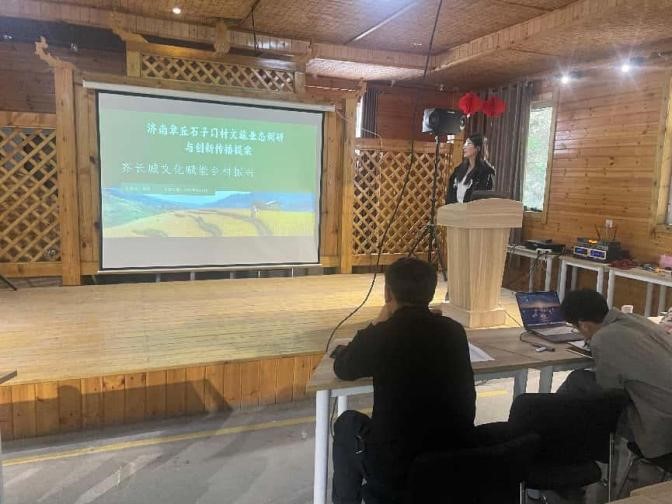 实训最后阶段,各小组就“齐长城古村落文化创意街区”主题进行现场汇报,并邀请石子口村村委会代表参加点评,师生交流热烈,成果展示务实高效,充分展现了学生扎实的理论功底与较强的实践应用能力。