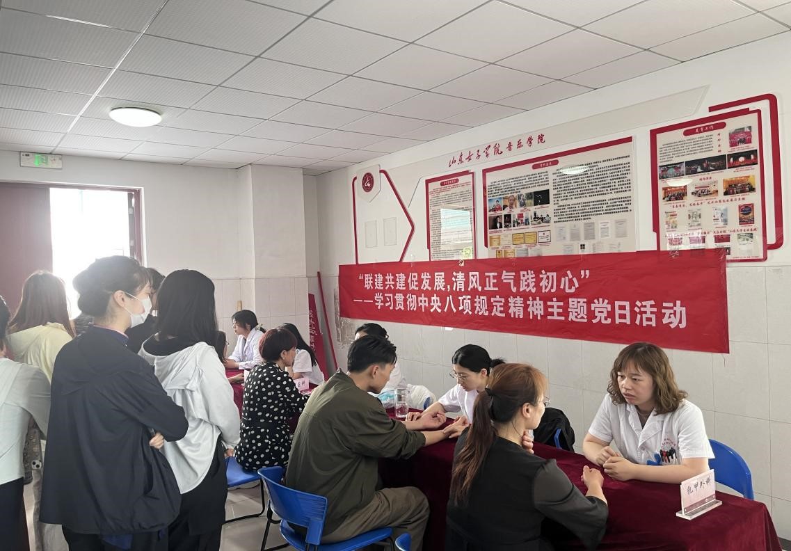 会后,党支部以“联建共建促发展,清风正气践初心”为主题,联合开展主题党日活动。山东省妇幼保健院总务科党支部的医护人员开展义诊,为师生提供健康诊疗,受到师生的热烈欢迎。