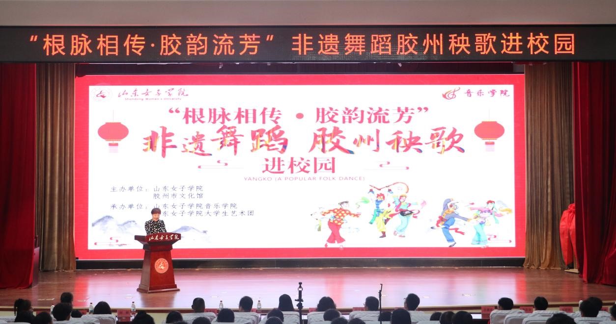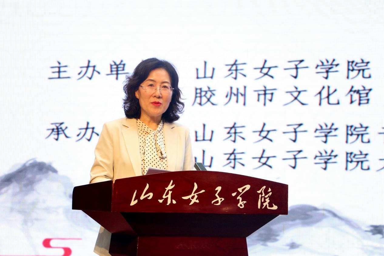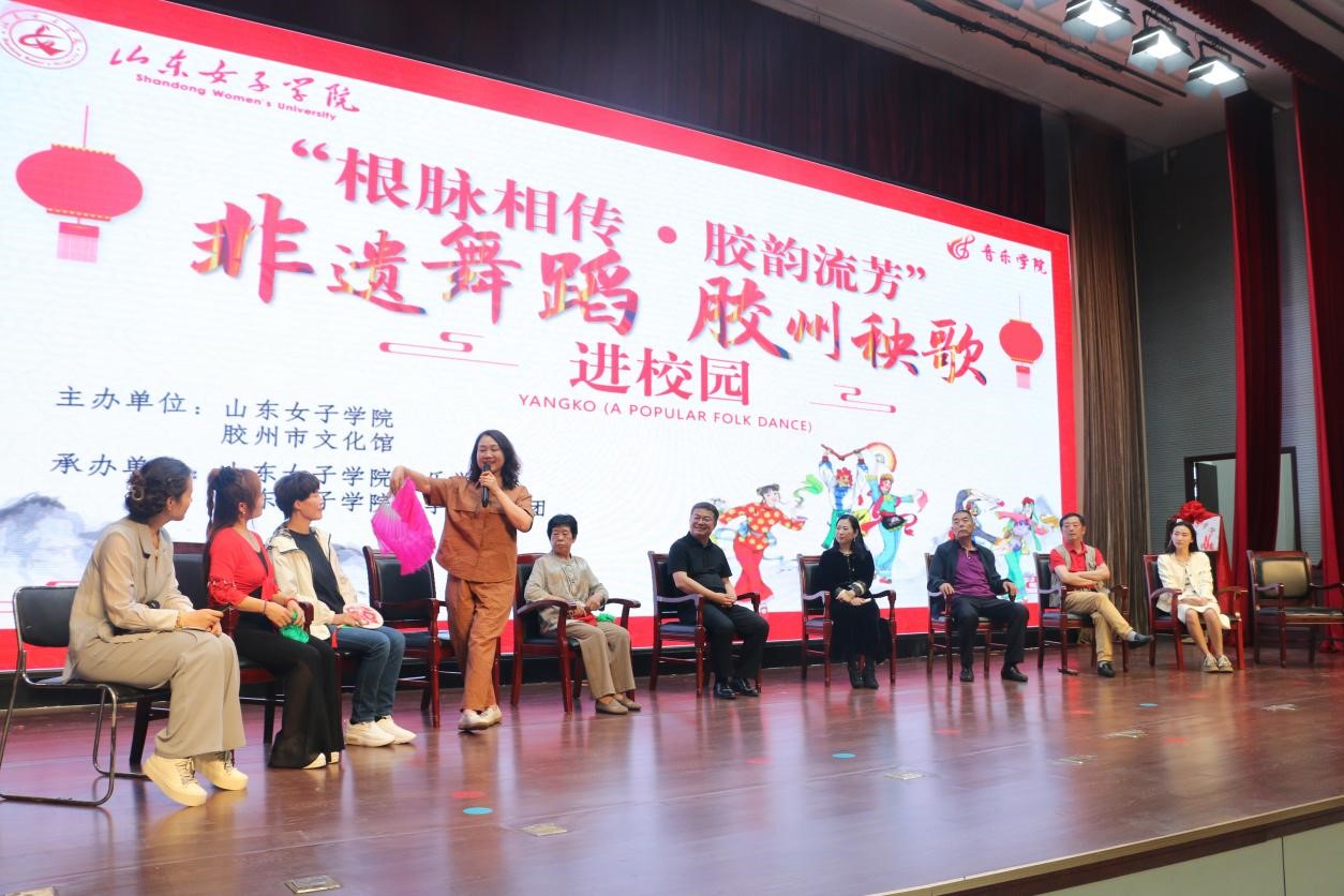 刘恩允代表学校致辞。她首先向胶州市文化馆、非遗传承人致以感谢,并对本次非遗进校园活动的成功举办表示祝贺。她希望以本次活动为契机,加大学校与胶州地区的合作交流,在传统文化传承与创新、胶州秧歌的承袭与发展、性别文化的艺术研究、非遗艺术的当代生态体系领域,进一步开展交流合作。